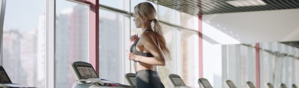 fitness woman running on treadmill in gym athlete woman using run machine in fitness c SBI 350633763